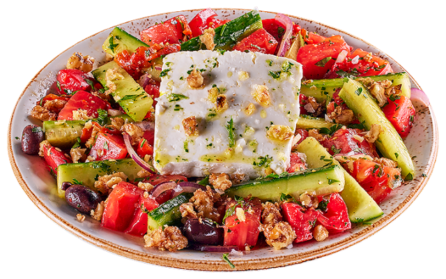 Розови домати, краставици, прясно краве сирене, печен пипер, маслини, червен лук, карамелизирани орехи, магданоз и магданозено песто.