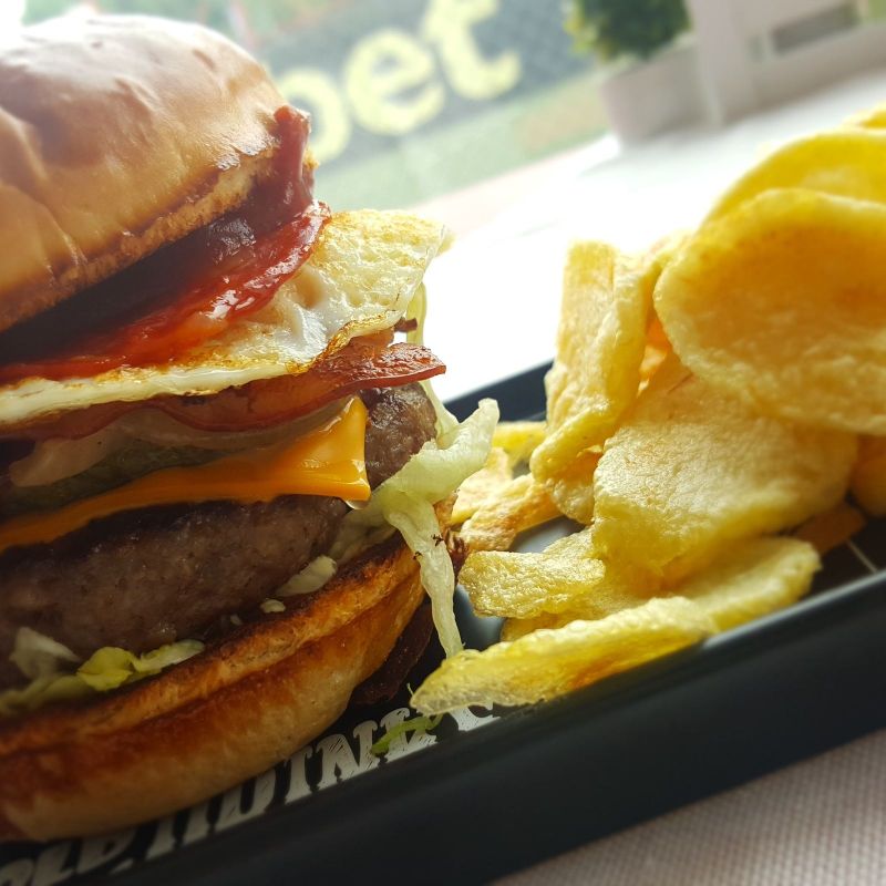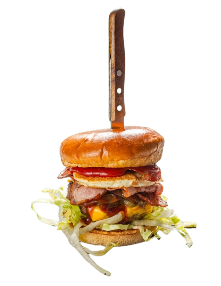 Телешки двойно смлян бургер, чедър, айсберг, специален сос, хрупкав бекон, BBQ HEINZ, чоризо, к.краставички, карамелизиран лук, яйце, кетчуп HELLMANN'S