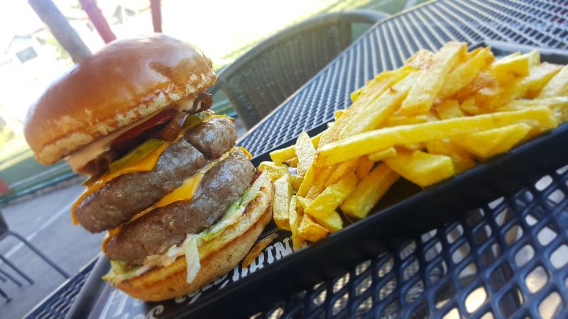 Tелешки двойно смян бургер., чедър. бургер сос, айсберг, домат, лук, кисела краставица, пържени картофки
