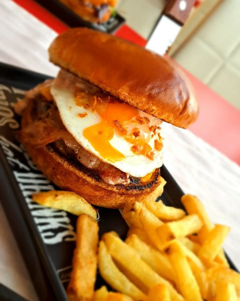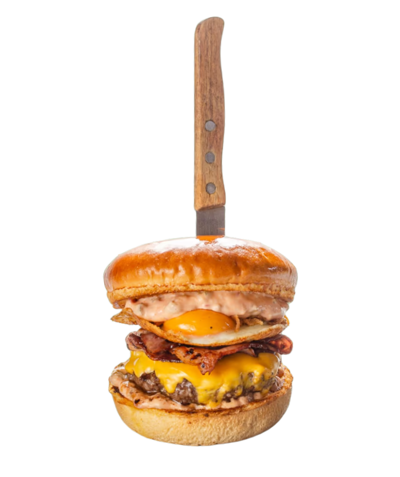 Телешки двойно смлян бургер, пикантен бургер релийш с халапеньо, бекон, чедър 2бр. яйце, хрупкав лук, пържени картофки /бургерът създаден специално за нашият най-голям фен и приятел Пепи Илиев с част от любимите му продукти/