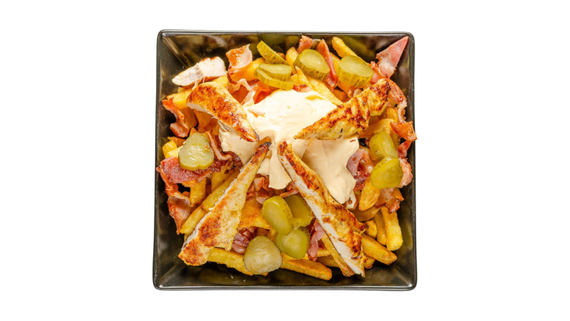 Пържени картофи, хрупкав бекон, пилешко филе, кисели краставички и чийзбургер сос