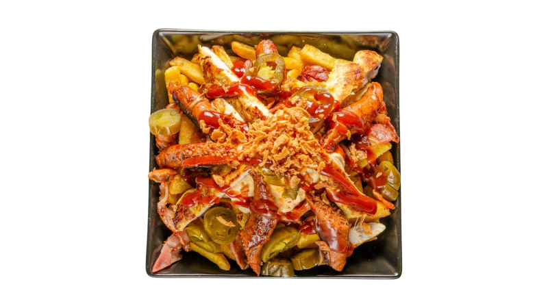 Пържени картофи, бекон, пилешко бонфиле, наденички чоризо, сос чедър, сос BBQ, хрупкав лук и Халапеньо