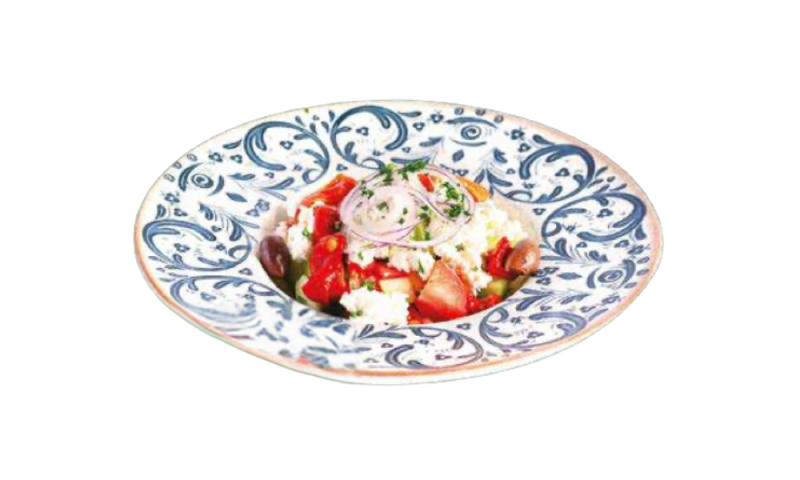 Домати, краставица, червен лук, прясна чушка, натрошено сирене, маслини и магданоз