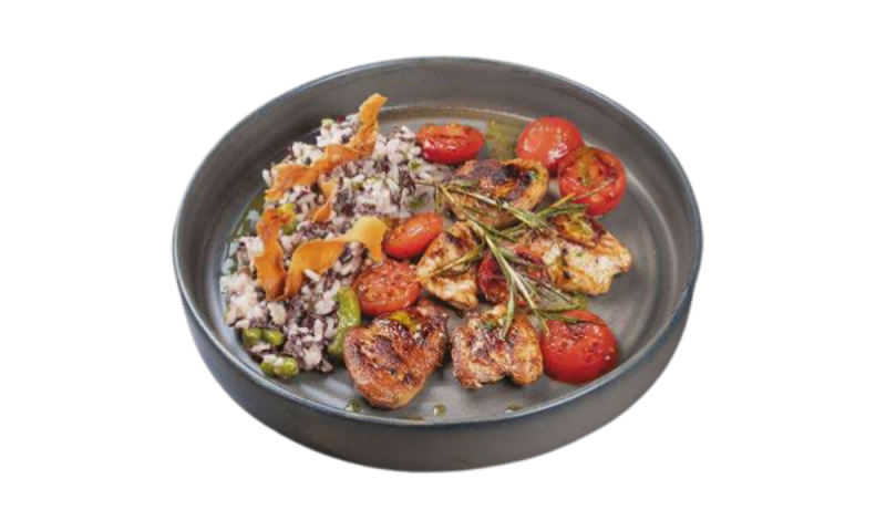 Върху ризото Делматино с аспержи и сотирани чери домати