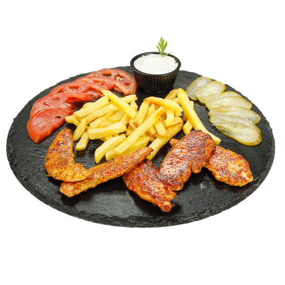 Пилешко месо на шиш, картофи, домати, кисели краставички, айсберг, питка и сос