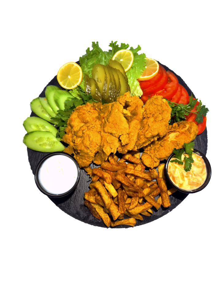 5х Криспи филенца, картофи, домати, кисели краставички, айсберг, питка и сос